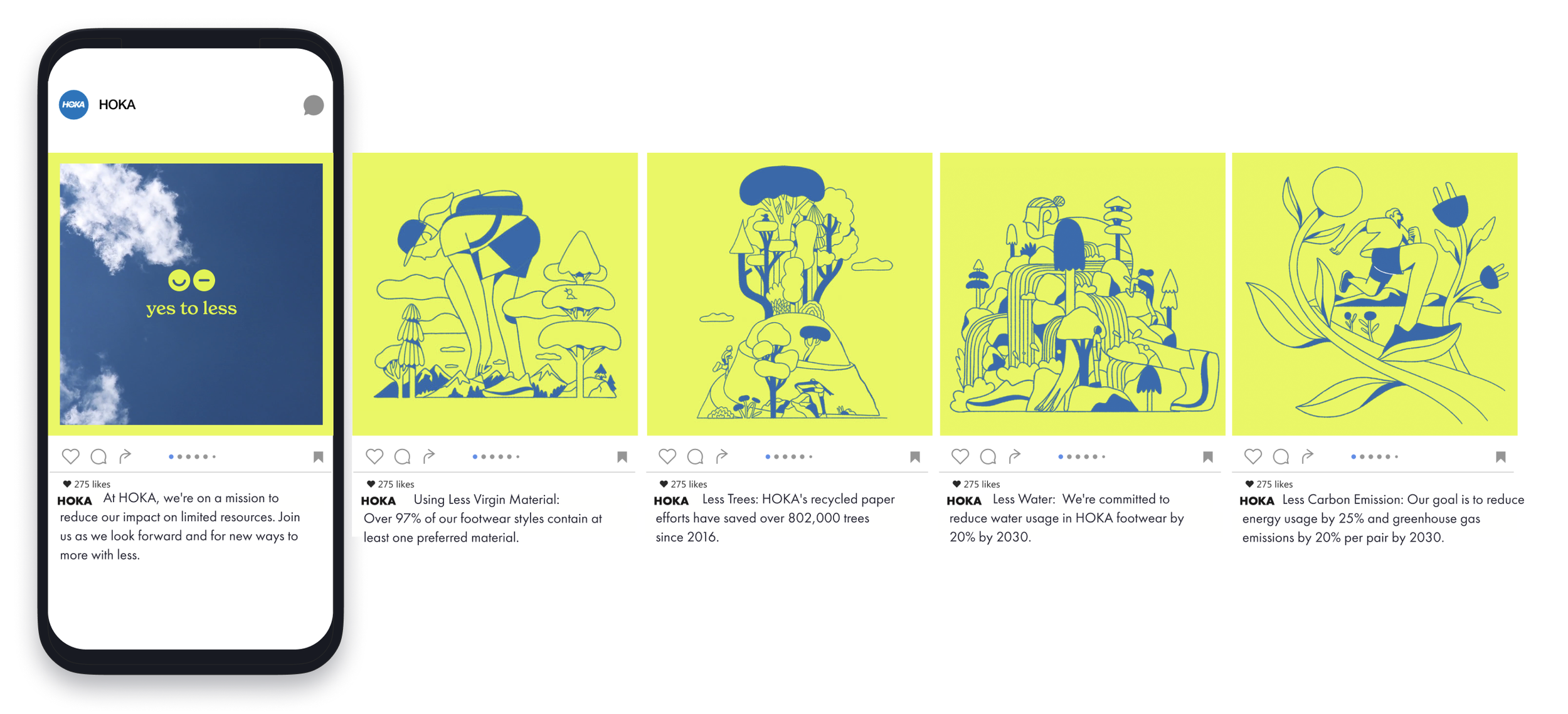 We all move through this planet in our own way—some run, some wander, some race—but we all share the same home. And home deserves care. At HOKA, we know that doing better isn't a finish line; it's a continual pursuit. To bring our pursuit to life, we developed a unique identity for our sustainability efforts featuring custom illustrations, animations, iconography, and messaging guidelines.
